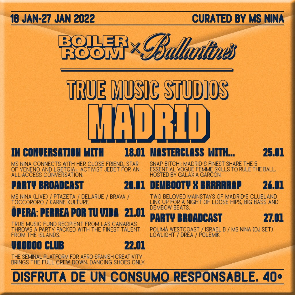 Boiler Room x Ballantine’s: True Music Studios abre sus puertas en Madrid durante diez días del 18 a 27 de enero para celebrar la inclusión en las pistas de baile y que verá a Ms Nina, autodenominada feminista del reggaetón y una de las artistas con la música siempre ready para el club con grandes mensajes sobre empoderamiento y positividad sexual femenina, presentando la nueva ola de Perreo y Rap español con espectaculares shows de artistas como la canaria Ptazeta que combina el rap más clásico con ritmos de dembow y el flow de su tierra o Delareu, un madrileño de ritmo uptempo repleto de fábulas callejeras en estilo Funky del Reino Unido, pasando por Brava y Toccororo o el colectivo Karne Kulture.