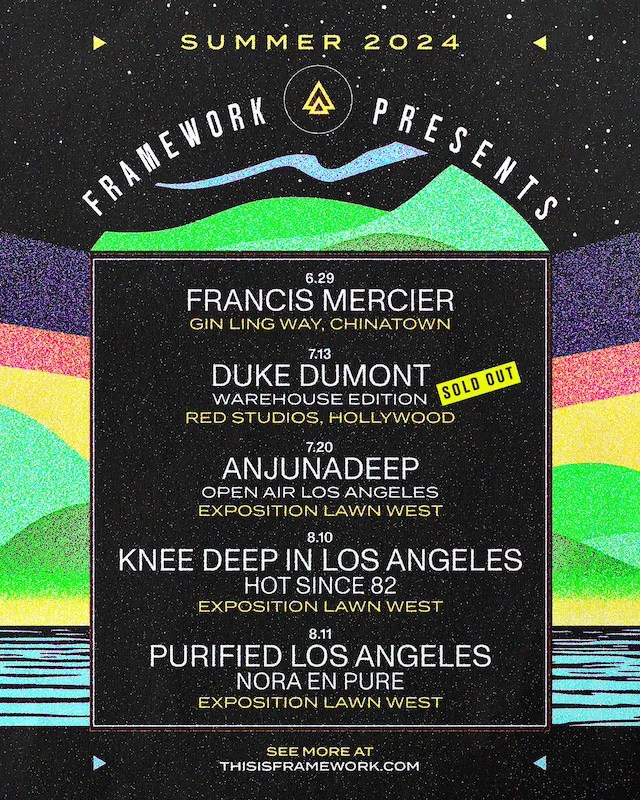 El promotor Framework, con sede en la costa oeste de los Estados Unidos, ha anunciado una serie de eventos de house y techno este verano en la ciudad de Los Ángeles. La programación incluye a los principales artistas Duke Dumont, Nora En Pure, Hot Since 82, Anjunadeep y Francis Mercier.